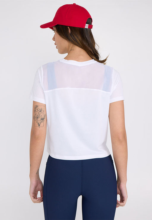 חולצת אימון קצרה עם חתכים מבד מנדף, צווארון עגולמידות דוגמנית S